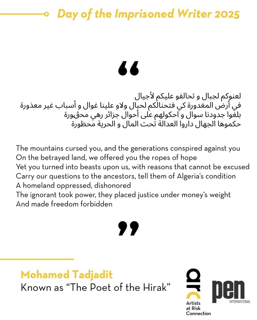 Algerian poet and activist Mohamed Tadjadit, known as “the poet of the Hirak”, was sentenced on 11 November 2025 to five years in prison, on top of the one-year sentence he was already serving, on baseless terrorism-related charges linked to his expression and peaceful activism. He continues to face prosecution in another case for his online posts. A leading voice of Algeria’s 2019 pro-democracy Hirak movement, he has endured years of harassment, arbitrary arrests, and imprisonment for his poetry and activism.